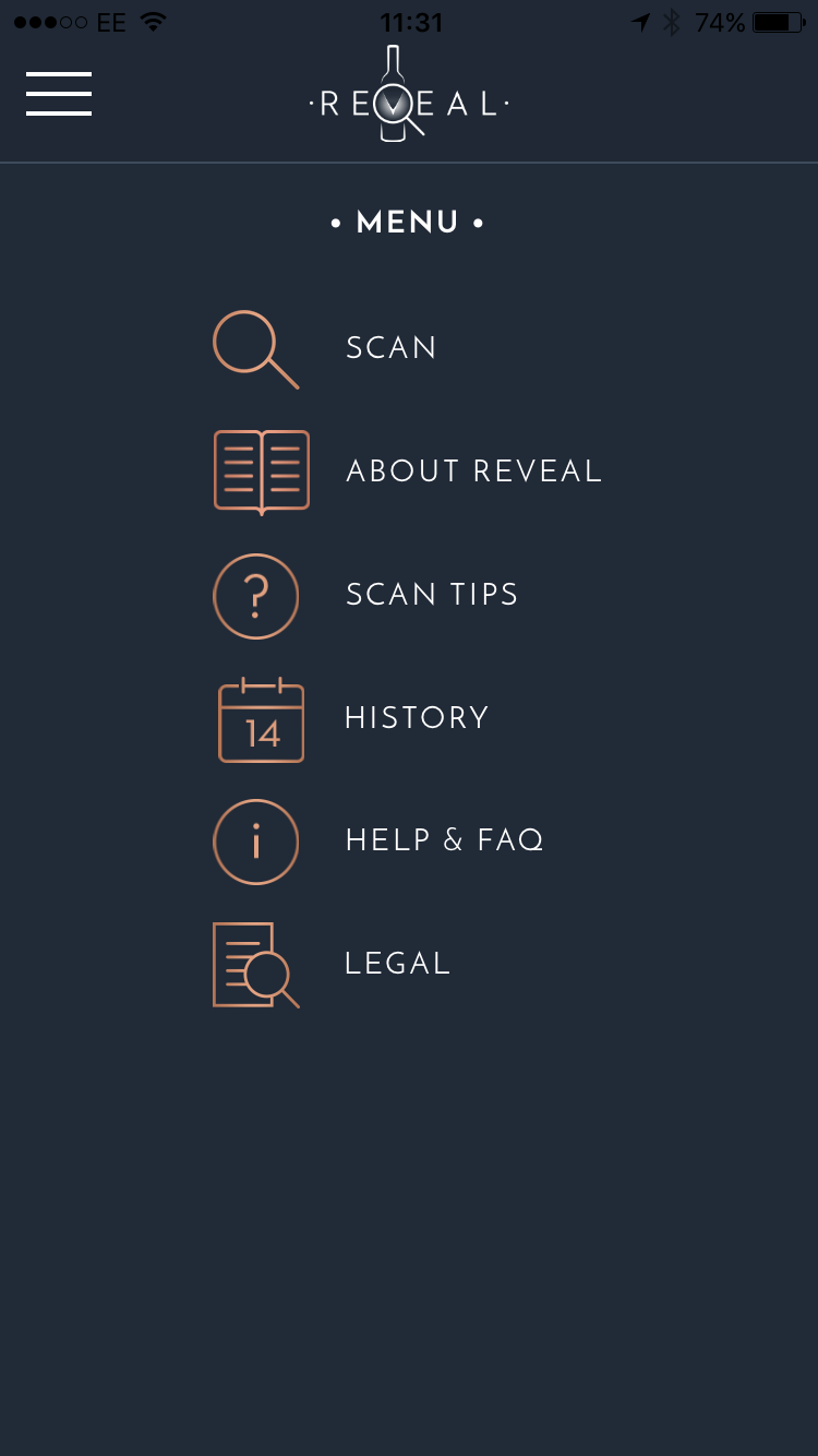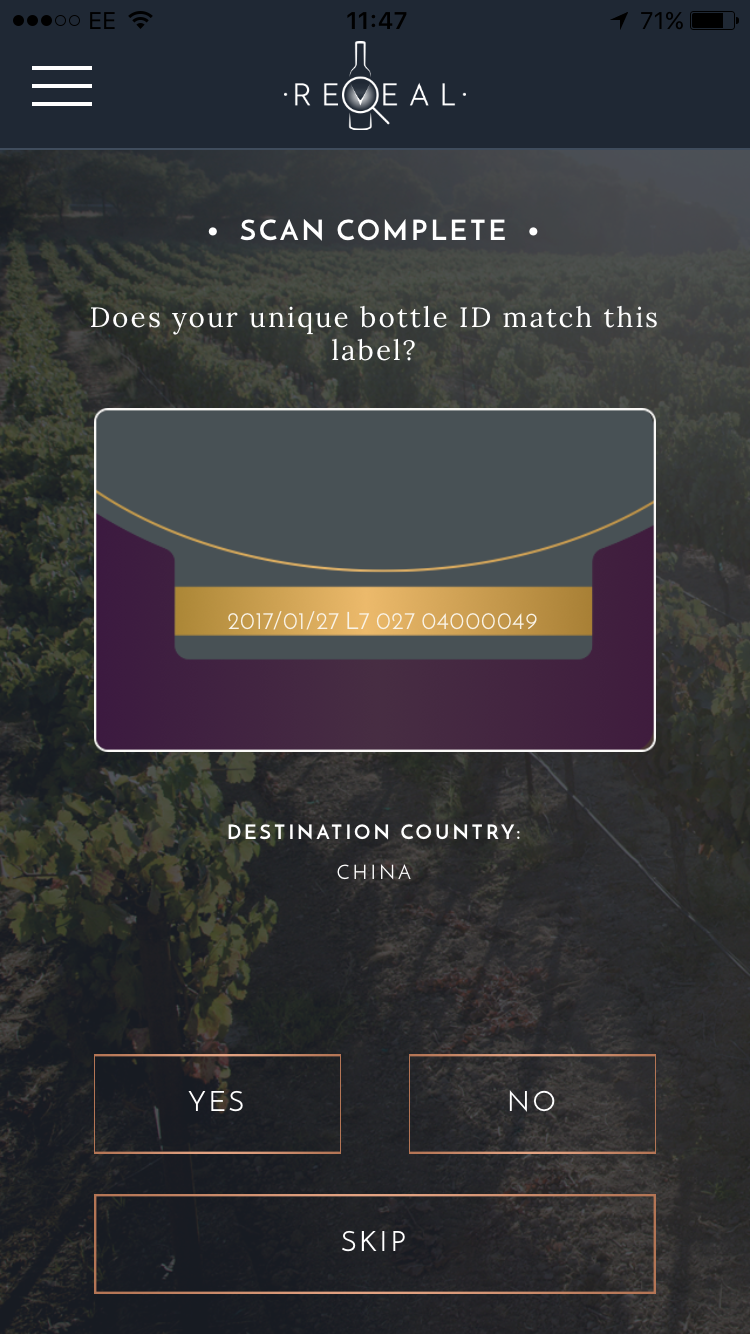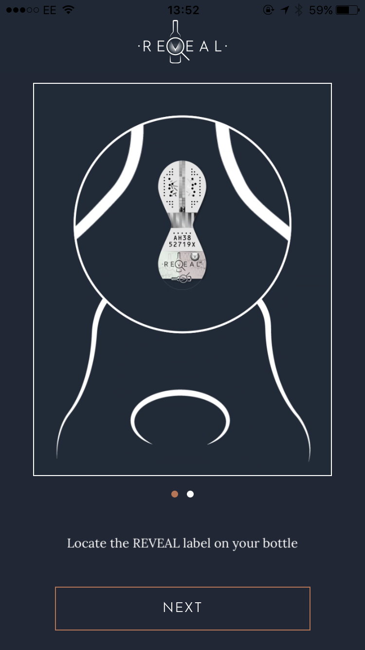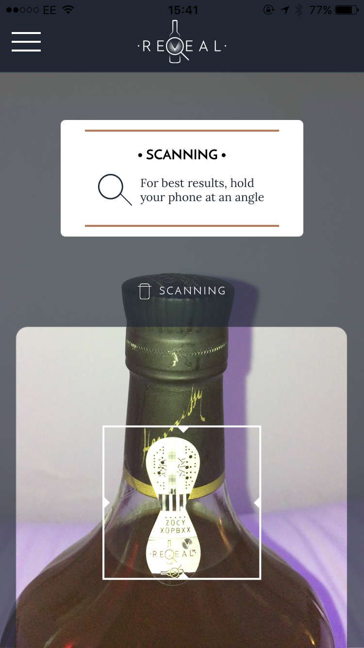 - Scan the REVEAL holographic optical verification labels to authenticate bottles